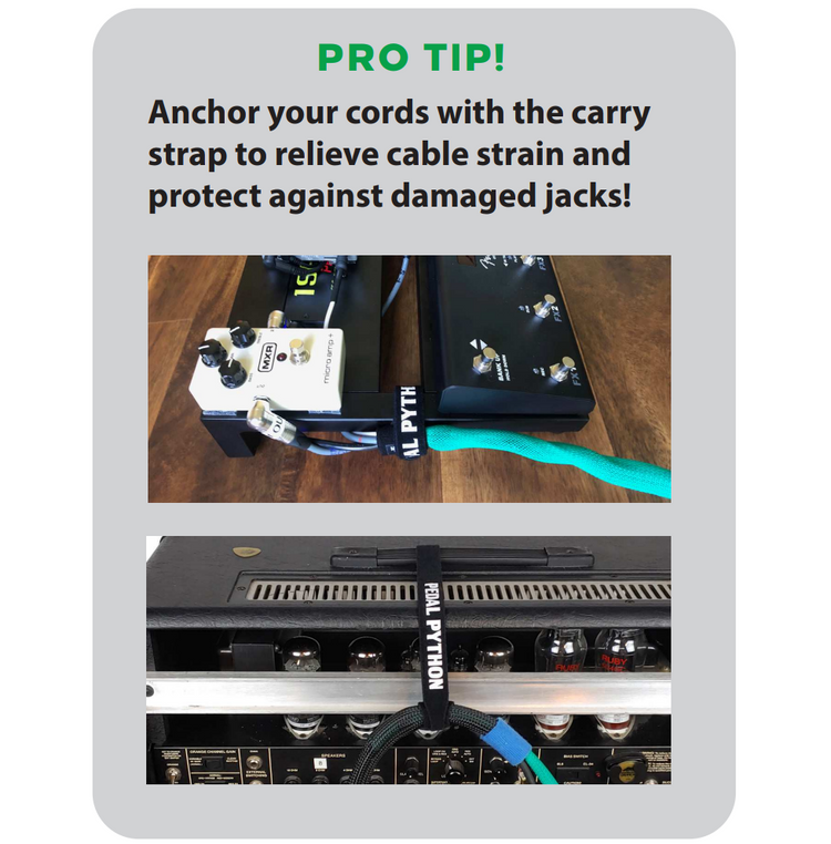 Perfect for stowing your Pedal Python between gigs and for securing Pedal Python to your amp or pedal board to prevent damaged jacks!